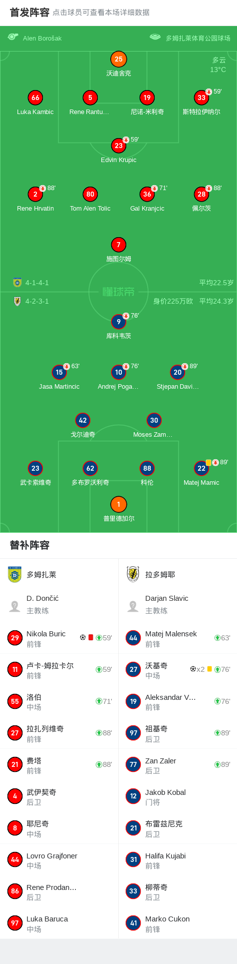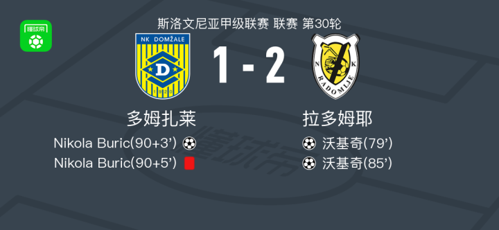 斯洛文尼亚甲级联赛第30轮,多姆扎莱主场迎战拉多姆耶。比赛中,拉多姆耶的沃基奇表现出色,完成梅开二度,为球队确立领先优势。补时阶段,多姆扎莱的Nikola Buric打入一球,为主队扳回一分。然而,随后Nikola Buric因犯规被红牌罚下。最终,多姆扎莱以1-2不敌拉多姆耶。