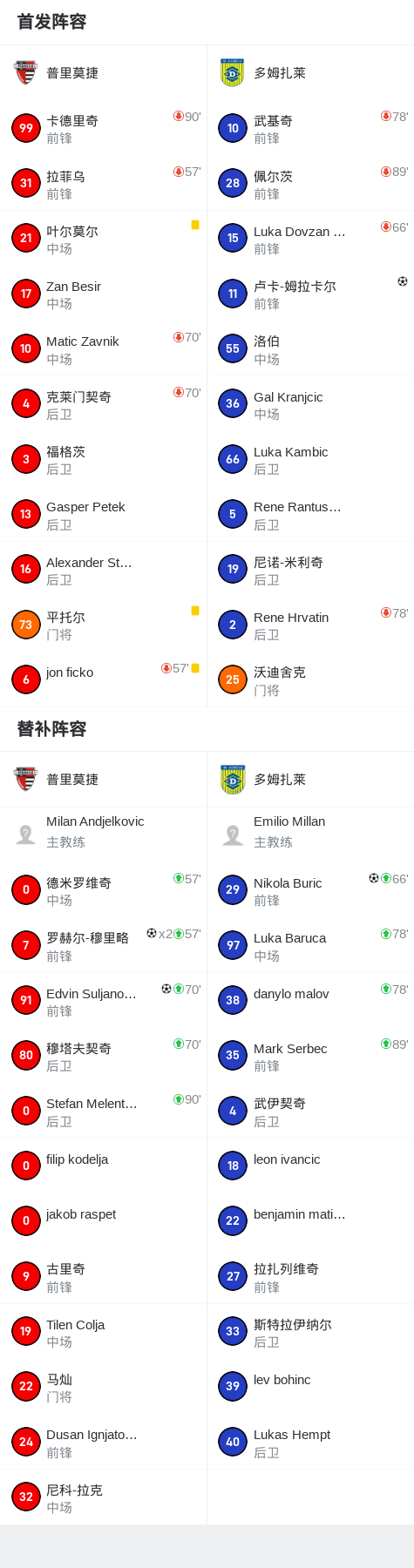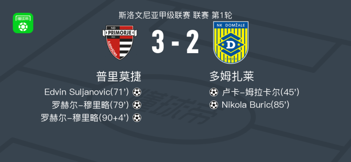 北京时间7月19日斯洛文尼亚甲级联赛第1轮,普里莫捷坐镇主场迎战多姆扎莱。上半场临近结束前,多姆扎莱球员卢卡·姆拉卡尔接队友Luka Dovzan Karahodzic助攻破门,帮助球队取得领先。易边再战,普里莫捷由Edvin Suljanovic扳平比分,随后罗赫尔-穆里略连入两球完成梅开二度,帮助主队反超比分。第85分钟,多姆扎莱由Gal Kranjcic送出助攻,Nikola Buric破门再度扳平比分。比赛进入下半场补时阶段,普里莫捷球员卡德里奇助攻罗赫尔-穆里略破门,助球队锁定胜局。最终全场比赛结束,普里莫捷以3-2战胜多姆扎莱。