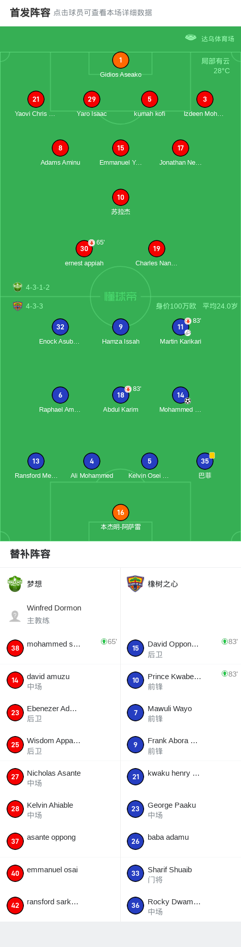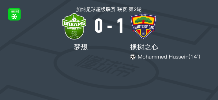 北京时间9月22日加纳足球超级联赛 联赛 第2轮,梦想主场对阵橡树之心。橡树之心Mohammed Hussein破门。最终比分梦想 0-1 橡树之心。