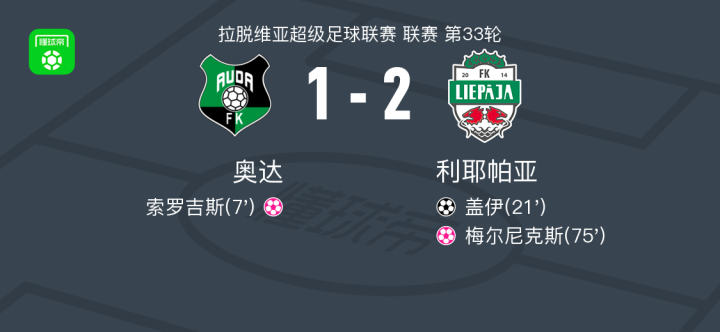 北京时间10月20日拉脱维亚超级足球联赛 联赛 第33轮,奥达主场对阵利耶帕亚。奥达梅尔尼克斯自摆乌龙。利耶帕亚盖伊破门,索罗吉斯自摆乌龙。最终比分奥达 1-2 利耶帕亚。